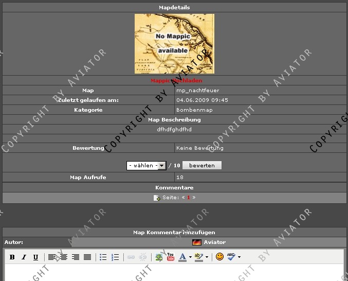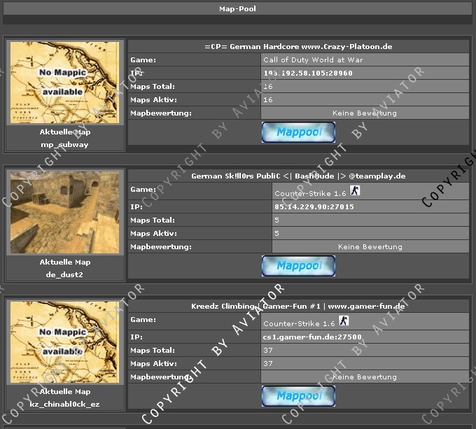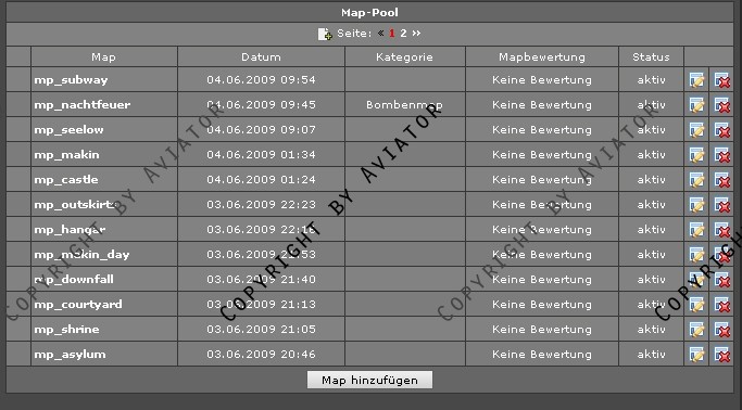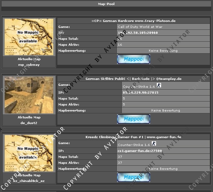 Mit diesem Mod könnt ihr euren Usern/Membern/Comunity zeigen was ihr so für maps auf lager habt ;-) Produkt - Features: - Anzeigen auf welchem Server was für maps laufen. - Die Maps können bewertet werden - Die Maps können kommentiert werden - Bugreporting um fehlerhafte Maps schnell entfernen zu können - Mapwünsche können geschrieben werden - Eine Wilkommennachricht für den Mappool kann verfasst werden ancah eigenen wünschen - Maps können editiert/gelöscht/hizufügefügt werden - Eine Top10 Anzeige die die 10 besten Maps anzeigt wieviele Maps es insgesamt gibt und wieviele davon aktiv sind - Anzeige welche Maps neu dazu gekommen sind - Mappic per einfachen klick in der jeweiligen detail Ansicht uploaden (falls keins vorhanden) - Option einer Autoerkennung d.h. sobald eine Map auf dem server läuft die nicht in dem Mappool ist wird diese eingetragen - Mappic reporting ihr bekommt eine PN sobald ein Mappic fehlt und könnt euren Pool einfach pflegen - Das higlight wir haben einen Server wo 3000 Mappics drauf sind mit einem einfaachen klick holt er sich das Mappic von unserem Server automatisch und kopiert das an die richtige stelle (SAFE Mode muss OFF sein) - Man kann im Admin menü Kategorien erstellen mit einem Suchmuster (z.B. wenn eine Map de_ enthaelt ist es eine Bombenmap) - Viele Einstellungen im Admin Menue - Version Kontrolle damit ihr immer auf dem laufendem seit. - Einfache installation - Nach dem kauf bitte ein Ticket machen mit eure Domain damit ich euch einen Lizenskey geben kann - und noch viel viel mehr Einfach auf die Preview Seite gehen einloggen und sich selbst ein bild machen